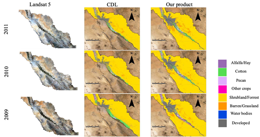 Figure 1: Comparison of Landsat imagery, CDL, and the developed 30-year CLCLU product, demonstrating improved crop-specific and transboundary land-use classification in the Middle Rio Grande.
