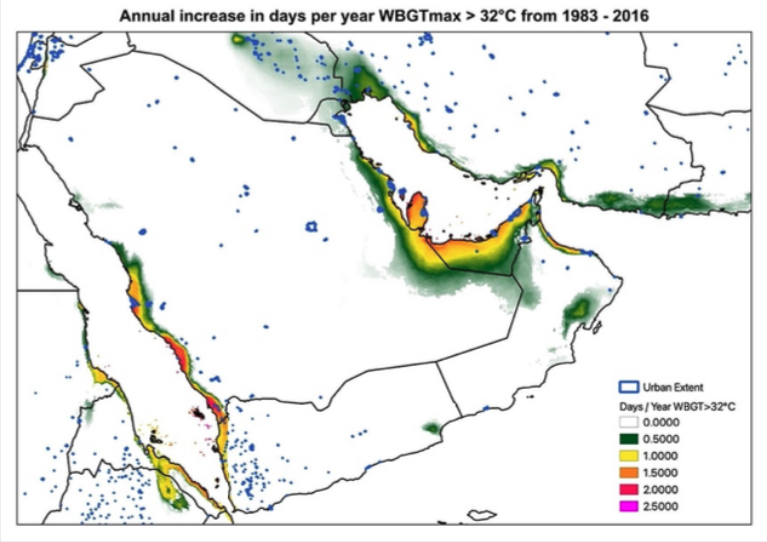 Figure 1: Average annual increase in the number of days per year where the maximum wet bulb globe temperature (WBGTmax) was greater than 32°C for the Arabian Peninsula, with urban boundaries overlayed (blue).