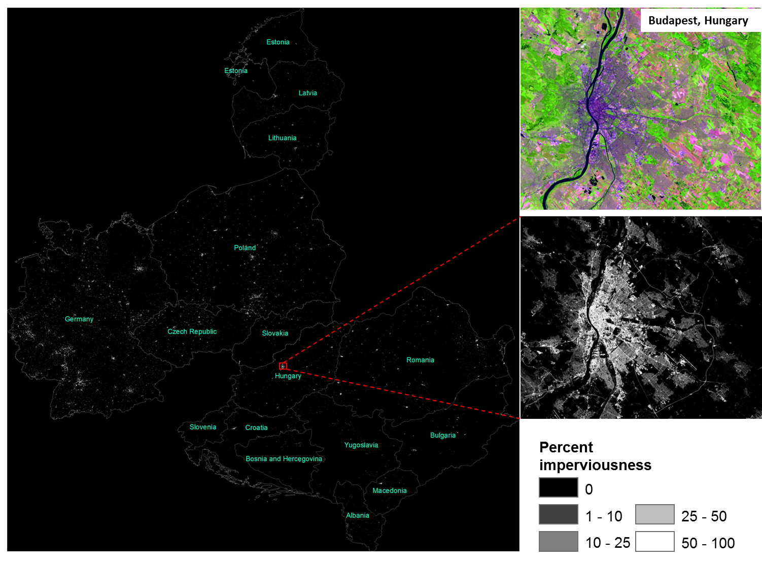 Figure 1. Urban impervious surface map for central and eastern European countries with a full resolution example over Budapest, Hungary.