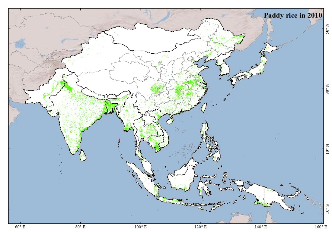 Figure 1. Spatial distribution of paddy rice fields in monsoon Asia in 2010 at 500-m spatial resolution, as derived from the RICE-MODIS mapping tool.